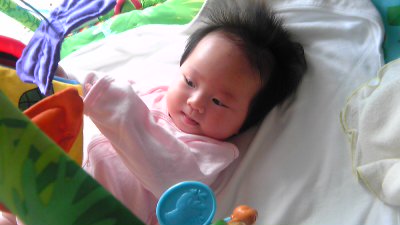 たいがい、片手でハイ&ローチェアをゆらゆらスイングさせながら、
